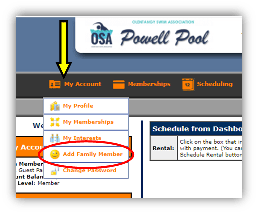 - Please make sure that you add the nanny/grandparent’s name(s) to your profile FIRST before you add the pass to your account. You can do this under the “My Account” tab and click on “Add Family Member” from the drop down. SEE BELOW.
